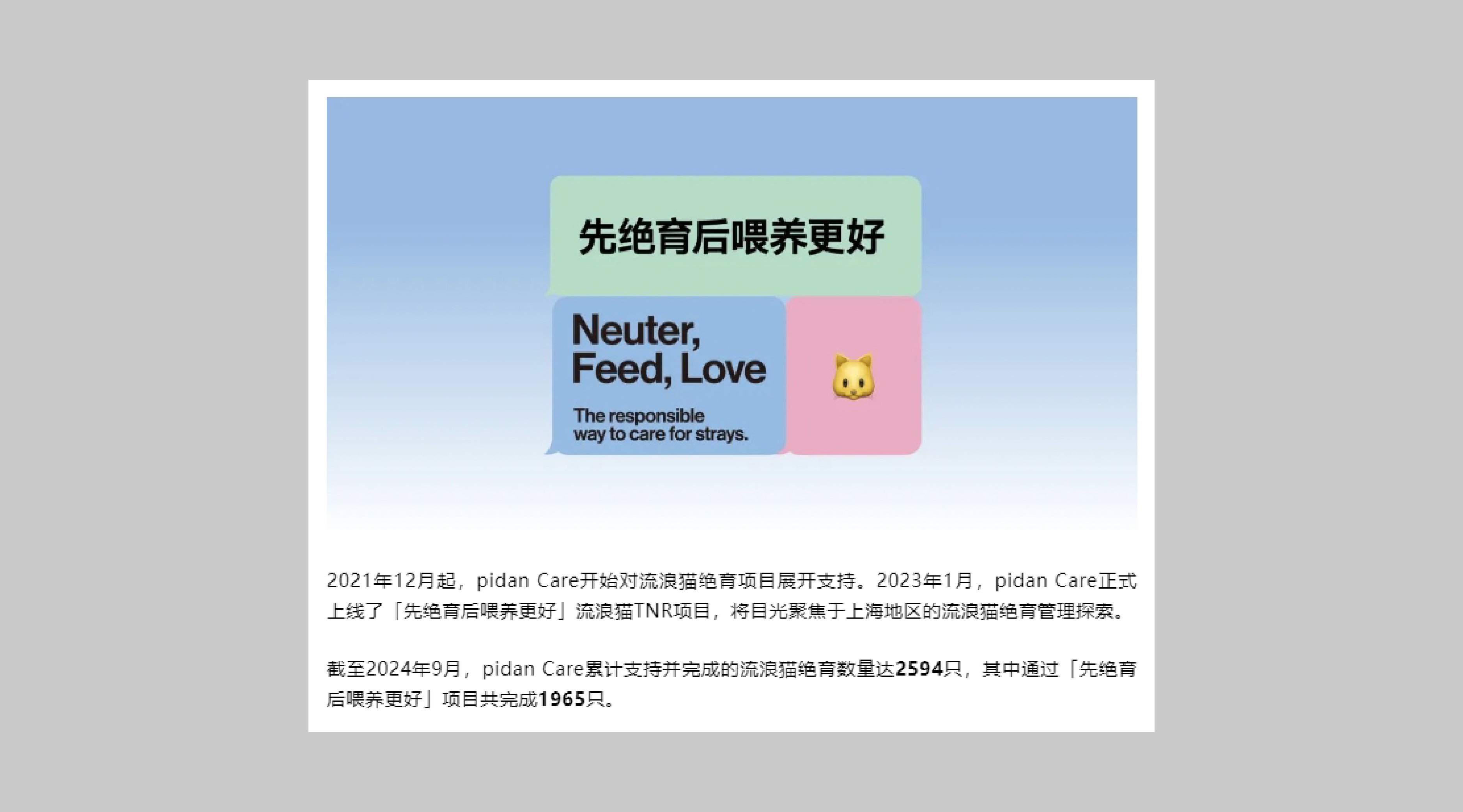 ピダンは猫のための製品を開発し、ピダンケアは猫を助けています。ピダン製品1点の販売につき0.15元が、野良猫の救助活動のためのピダンケア慈善口座に寄付されます。