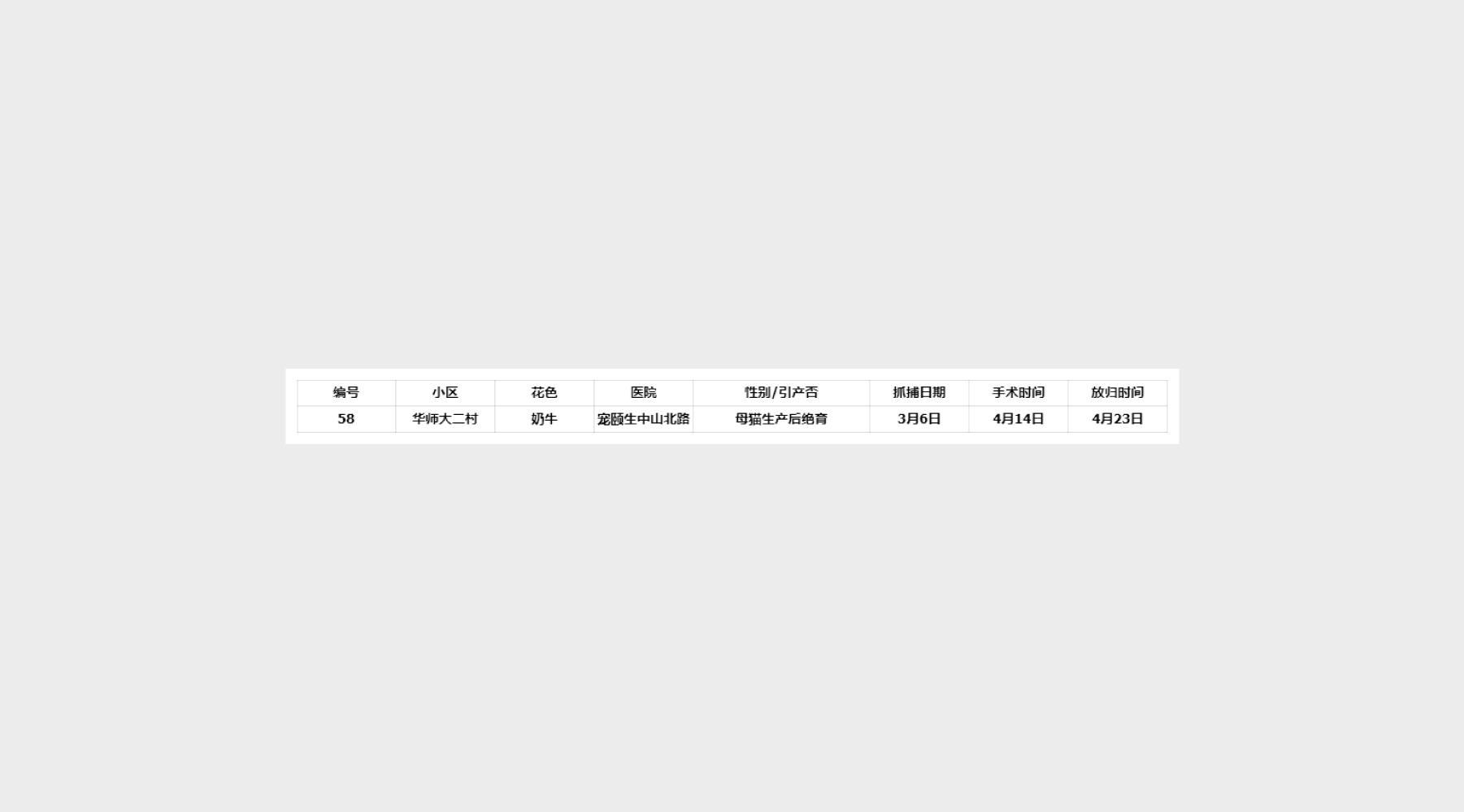 pidan Care cooperated with Two Tails to complete the sterilization of 1 stray cat in Hankou Community.